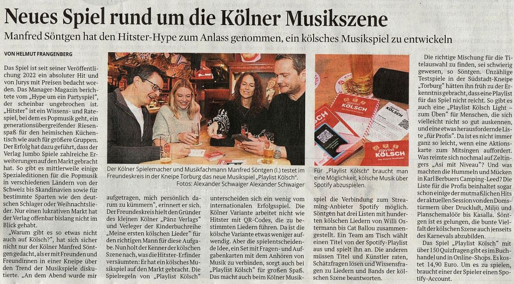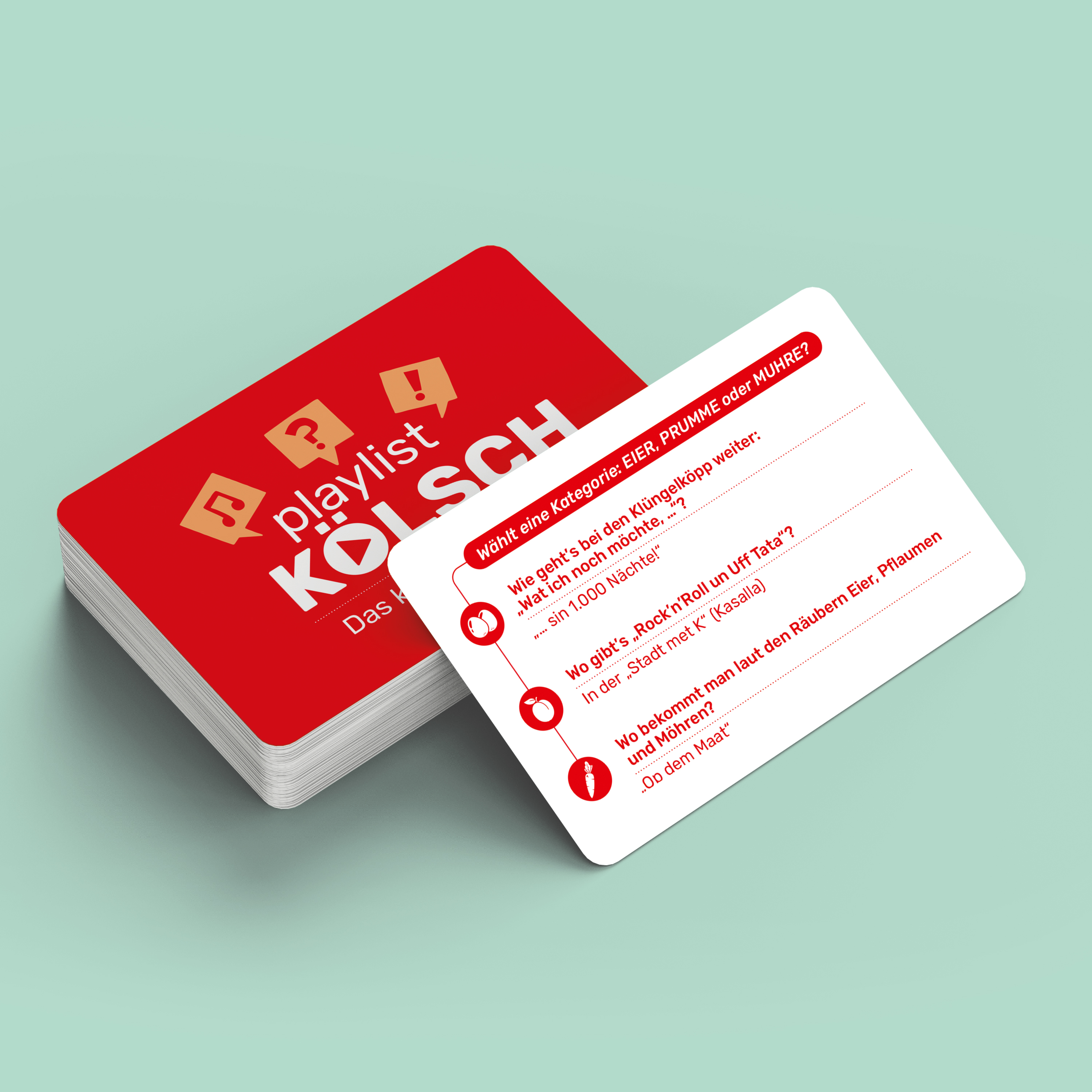 Playlist Kölsch ist das neue Kartenspiel für alle, die Spaß an kölscher Musik haben. Die Mitspieler hören auf ihrem Handy die besten kölschen Hits der letzten Jahre, dazu wird gesungen, gefeiert und geraten.