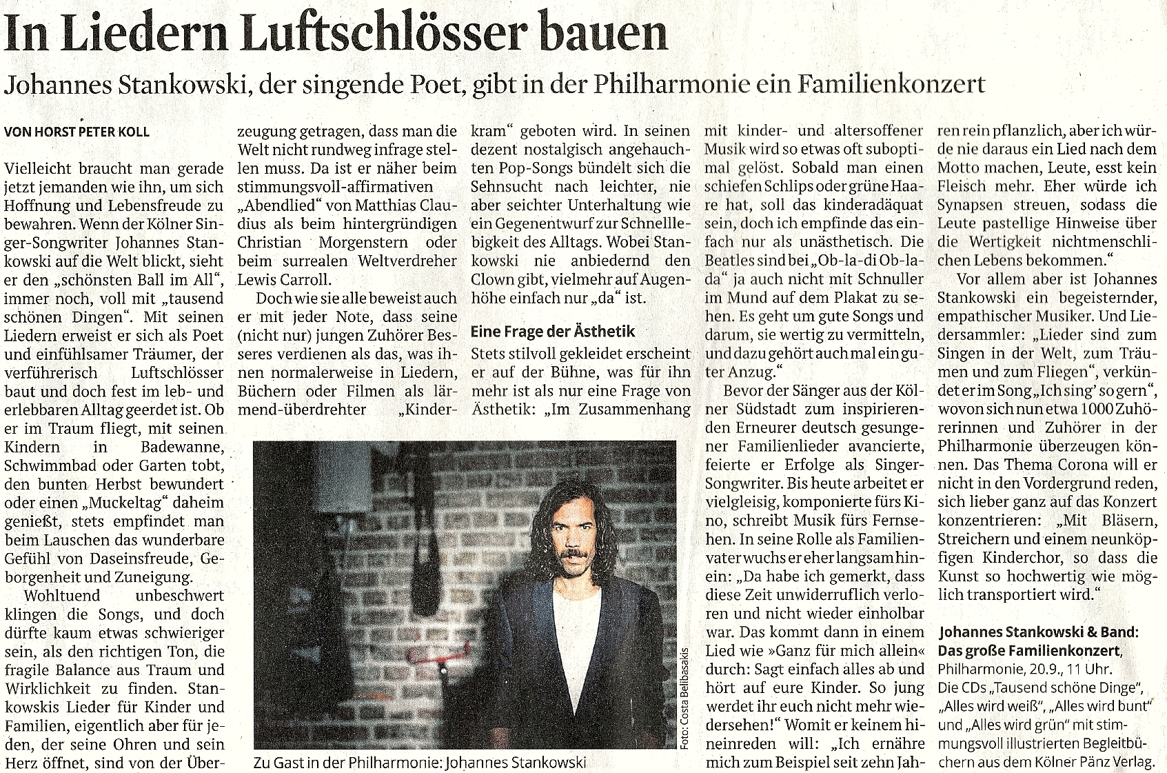 Johannes Stankowski macht Kinder und Erwachsene froh, seine Lieder zählen zum Besten, was das Genre „Musik für die Kleinen“ zu bieten hat, weil sie ernst zu nehmende Melodien und Texte besitzen. (Musikexpress)